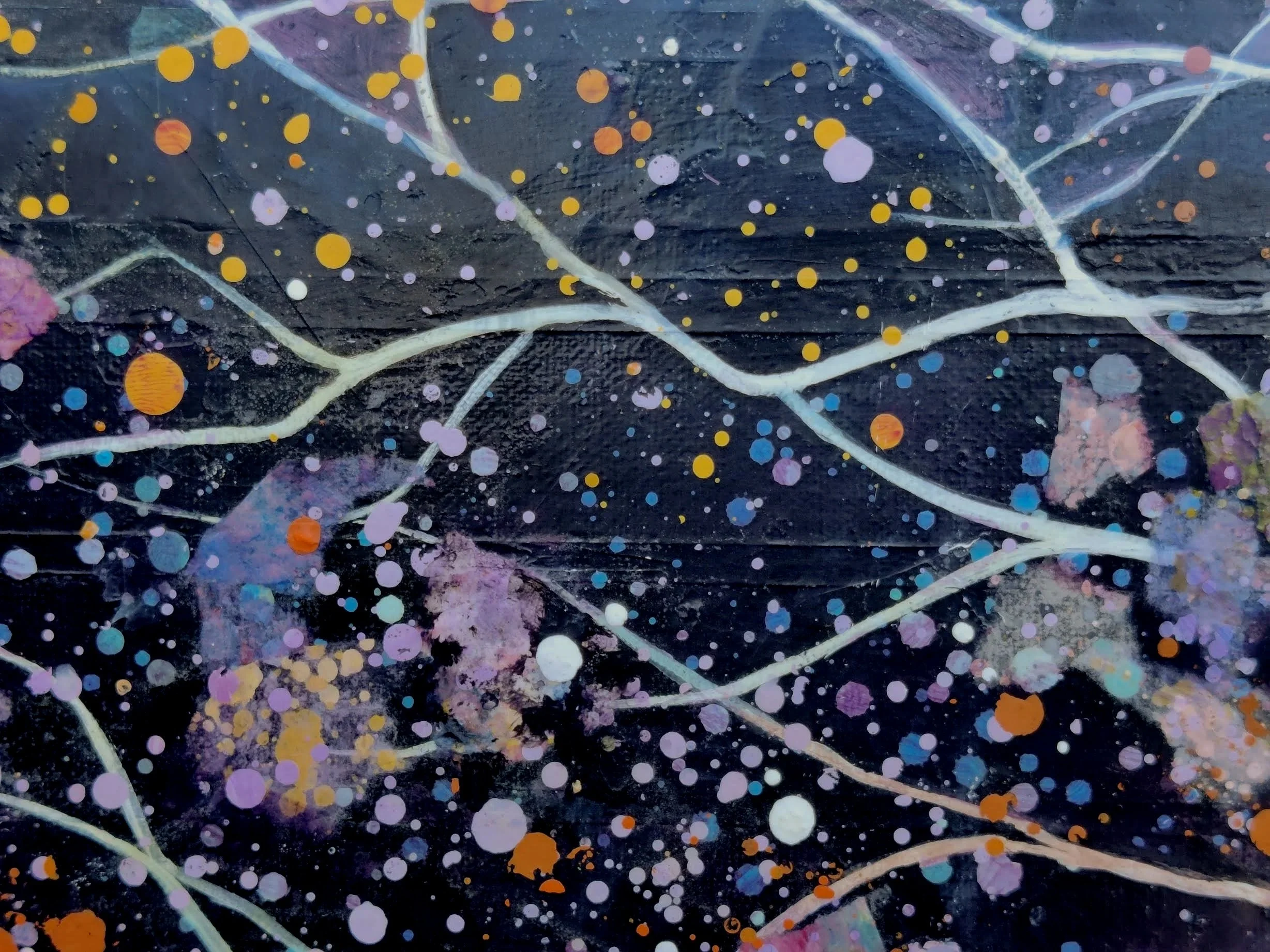Blending abstraction with symbolic landscape, this original mixed media painting explores cycles, transformation, and the hidden innocence and jubilance of the natural world. It is both celestial and terrestrial — a meeting of sky, ocean, and flowering branch in one suspended breath.