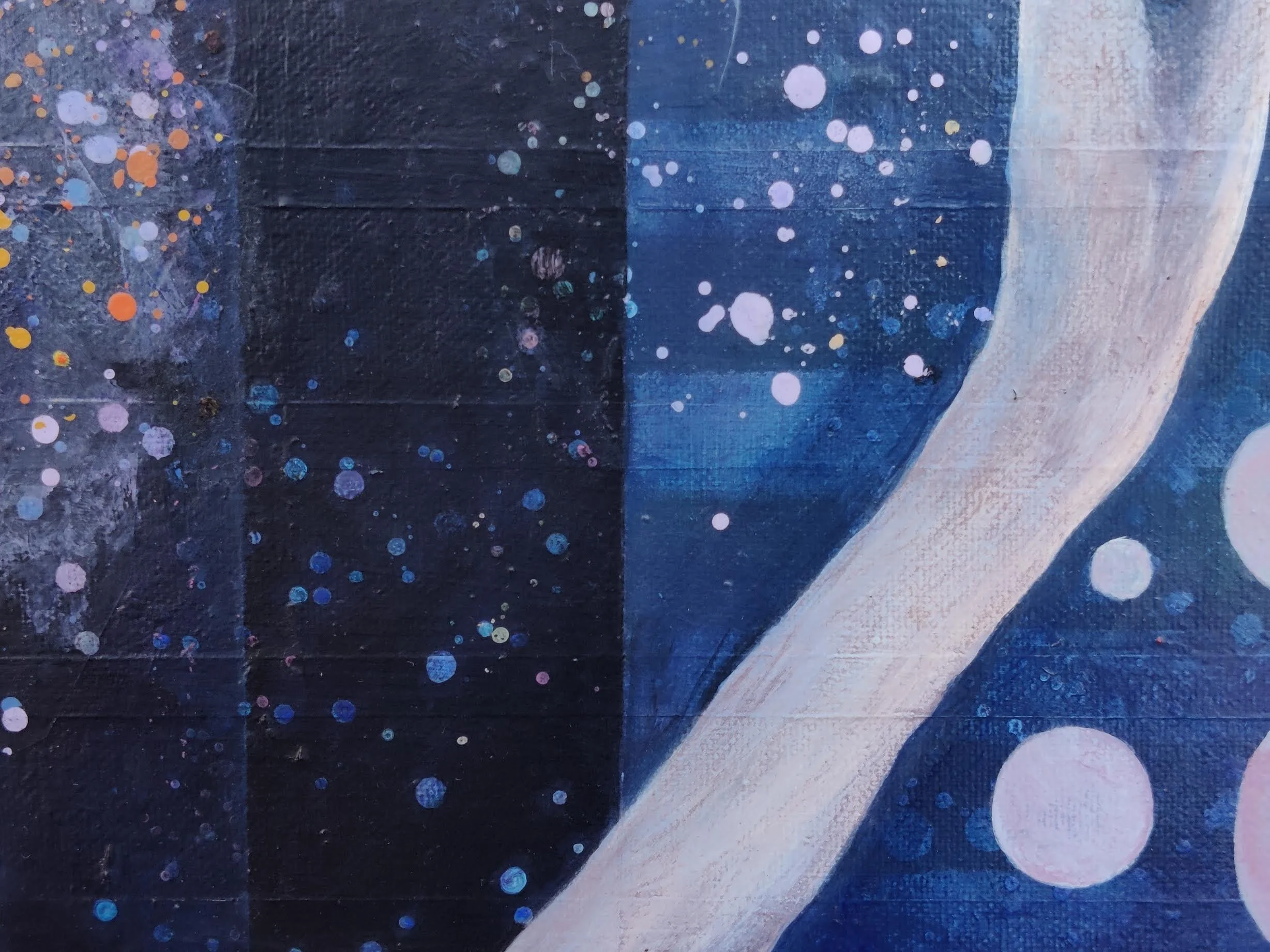 Constellations shimmer across layered fields of midnight blue and cosmic black. Circular forms rise along the canvas like lunar phases, portals, or bubbles ascending from the deepest sea. The white trunk curves upward like an axis between worlds — earth rooted below, moonlight calling above.