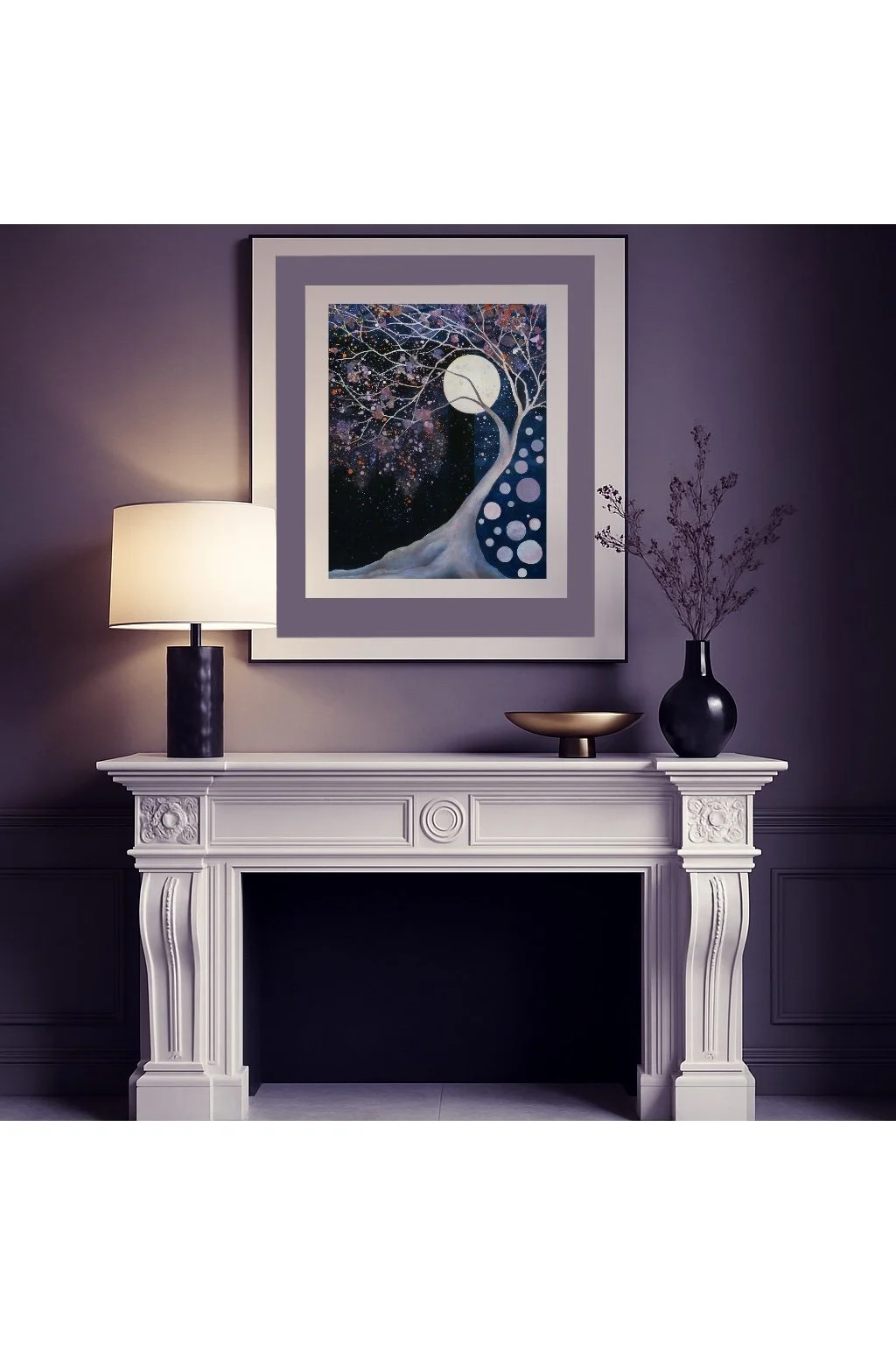 Beneath a luminous full moon, a pale, almost bone-like tree bends toward the sky — its branches scattering color like laughter carried through the night air.
