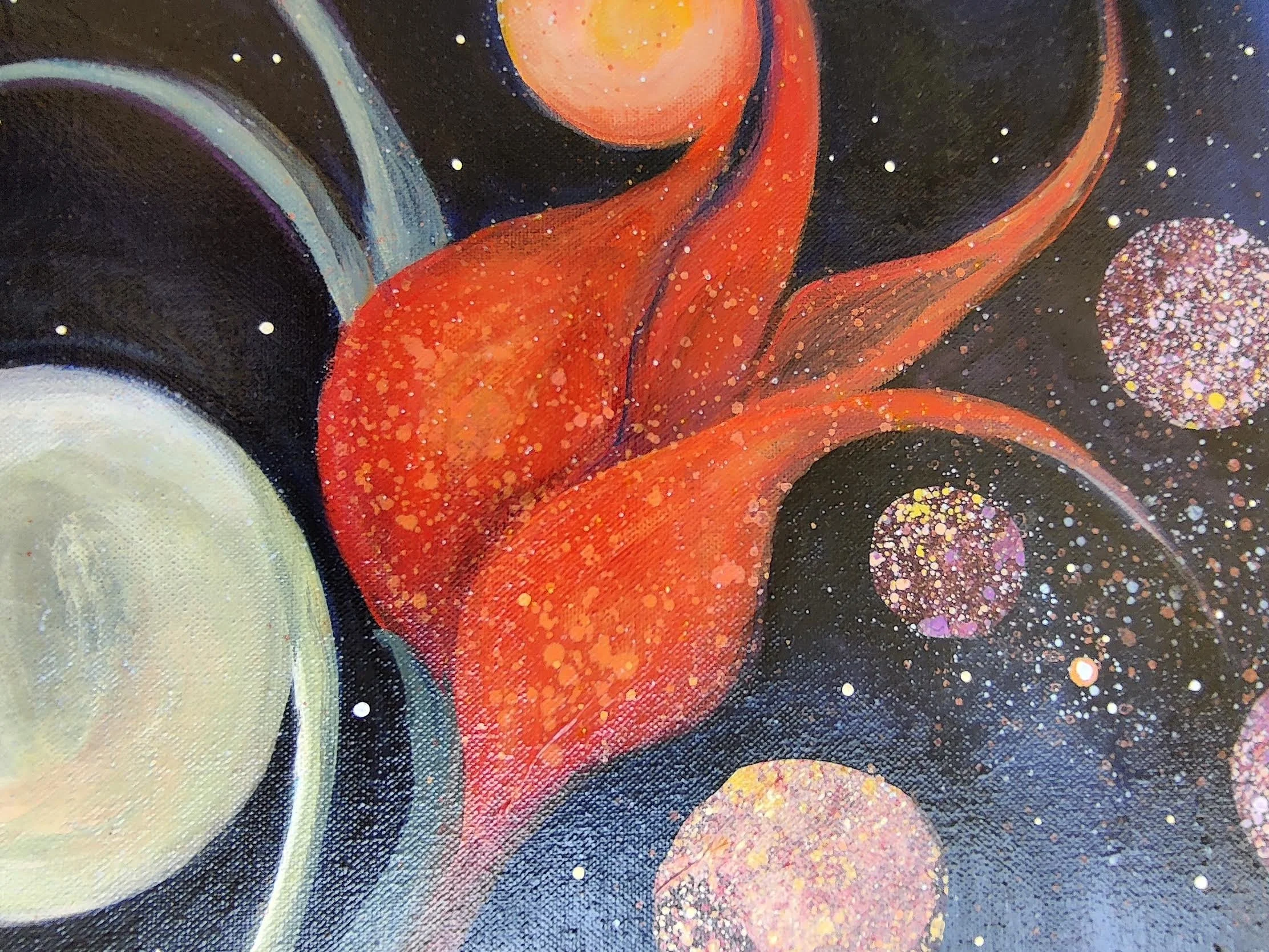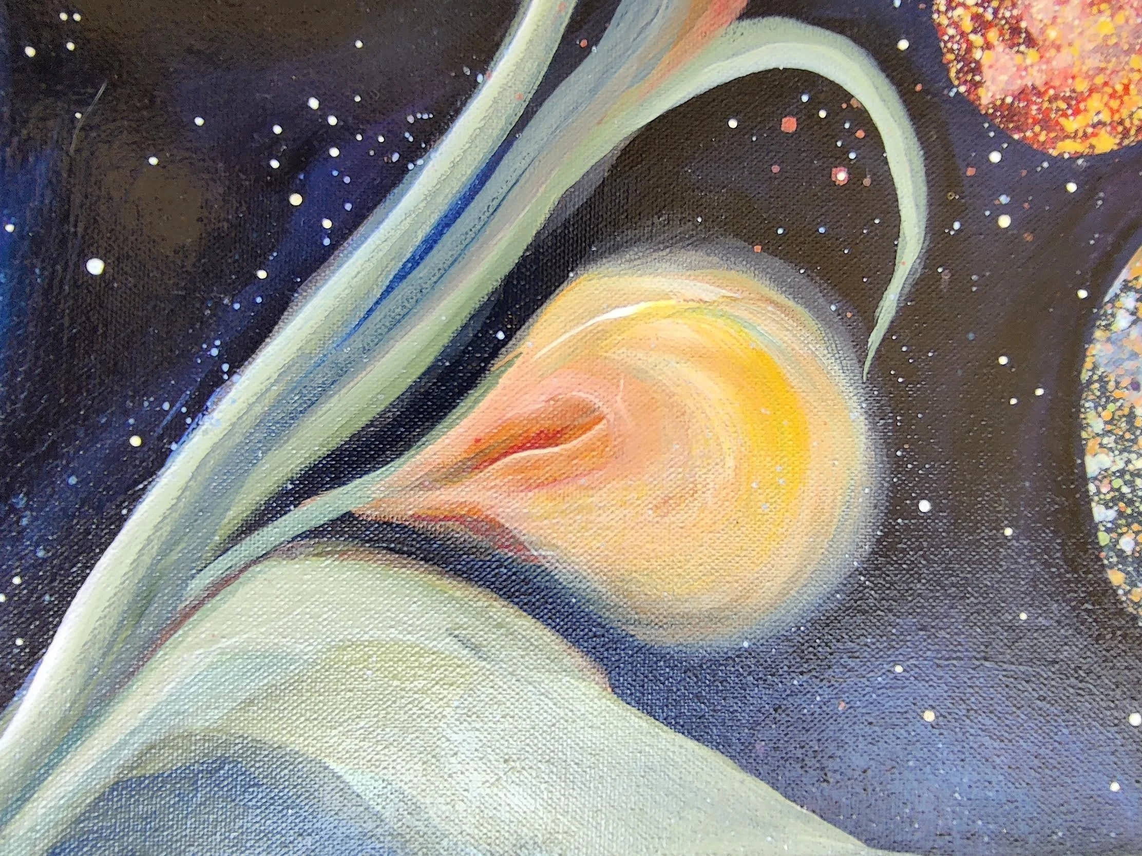 Emanating from archetypal depths, this spiritual portrait unveils the unseen architecture of love, creation, and compassion that holds existence together. The painting invites the viewer on a voyage into inner space — a recognition of the source of life who transcends all boundaries, who births planets and stars.