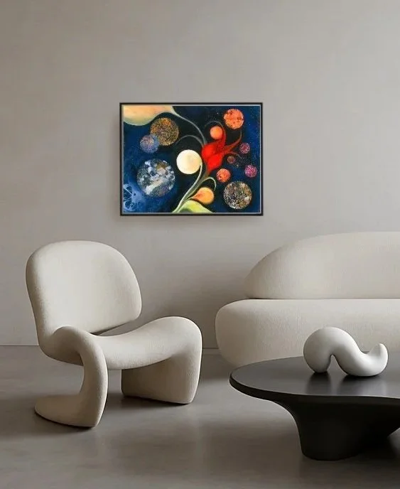 Through radiant color and subtle form, Sabrina Laumer weaves a visual language that is both expansive and tender. She takes the masculine, deconstructionist tools of abstract expressionism and reclaims them — reassembling their energy into a celestial cloak of femininity, depth, and grace.