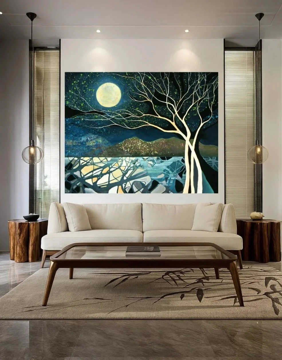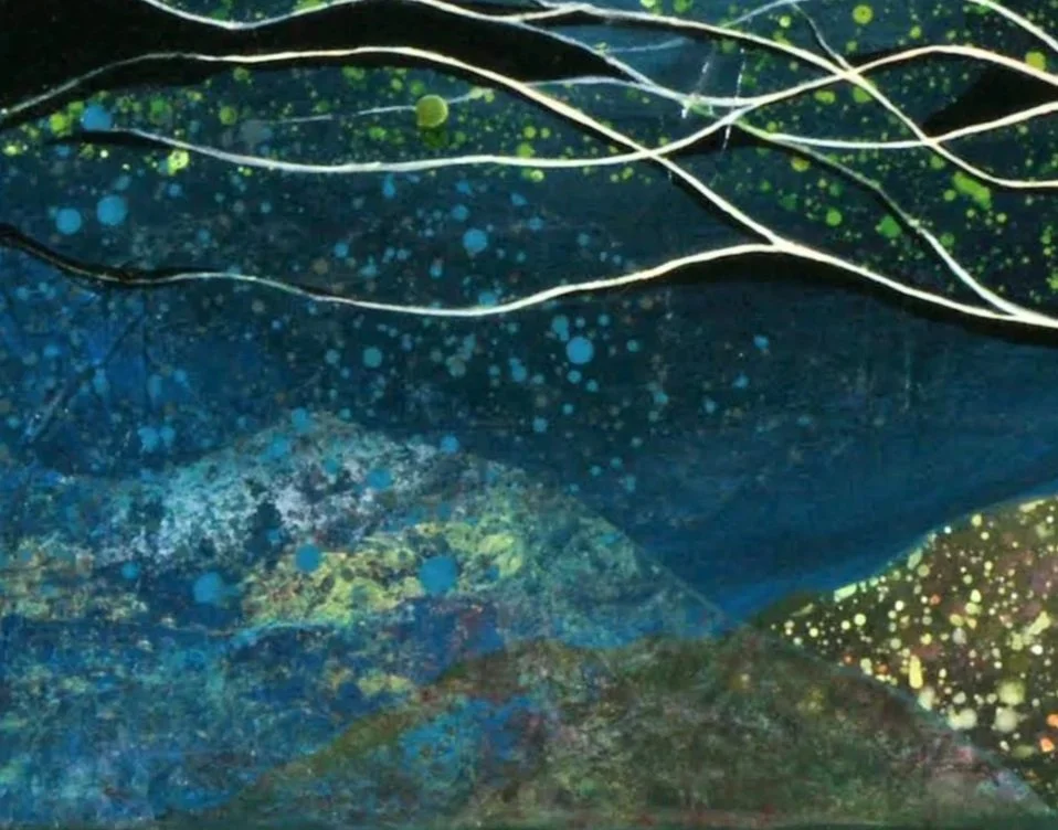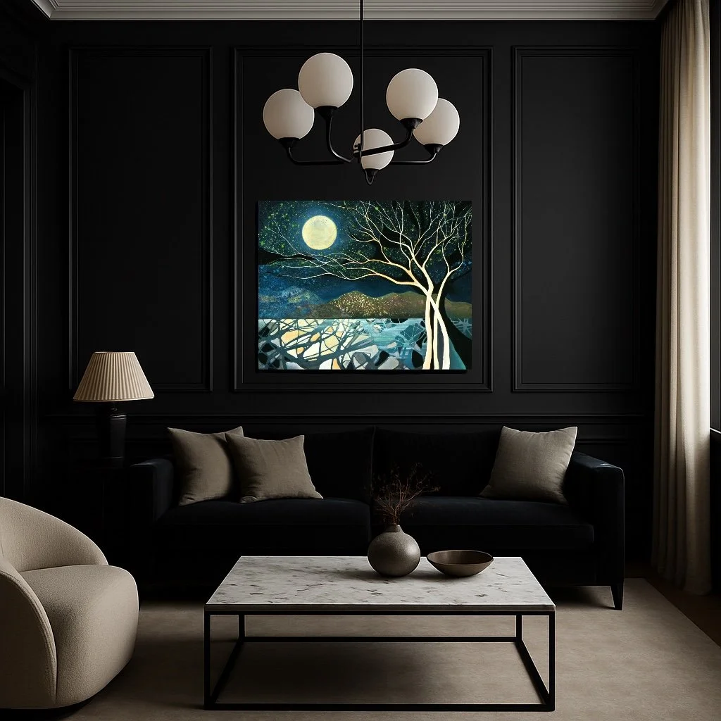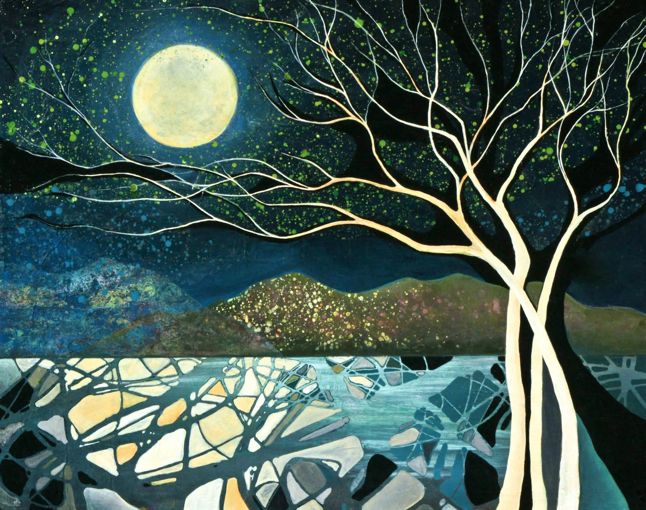 Nocturne for a River is a contemplative spiritual landscape painting. This abstract moonlit painting evokes the intimacy of nature after dark, where softness and shadow meet in peace.