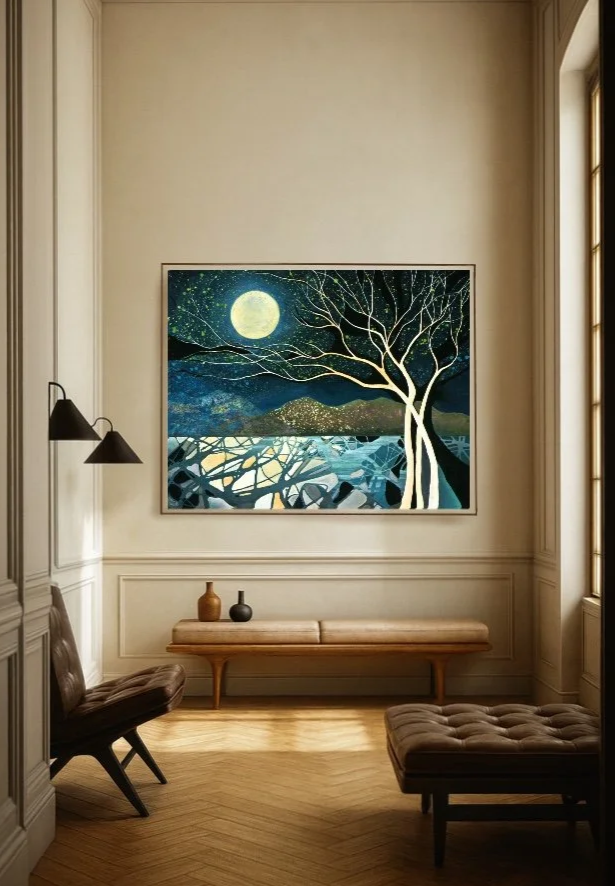 Here moonlight plays across the water like fingers on piano keys, making the composition ripple with quiet musicality — a prayer conceived under sky, unfolding gently across the surface of the soul. It invites the viewer into a dreamlike passage where memory and atmosphere merge, and the sky becomes a silent witness to what is most deeply felt but rarely spoken.