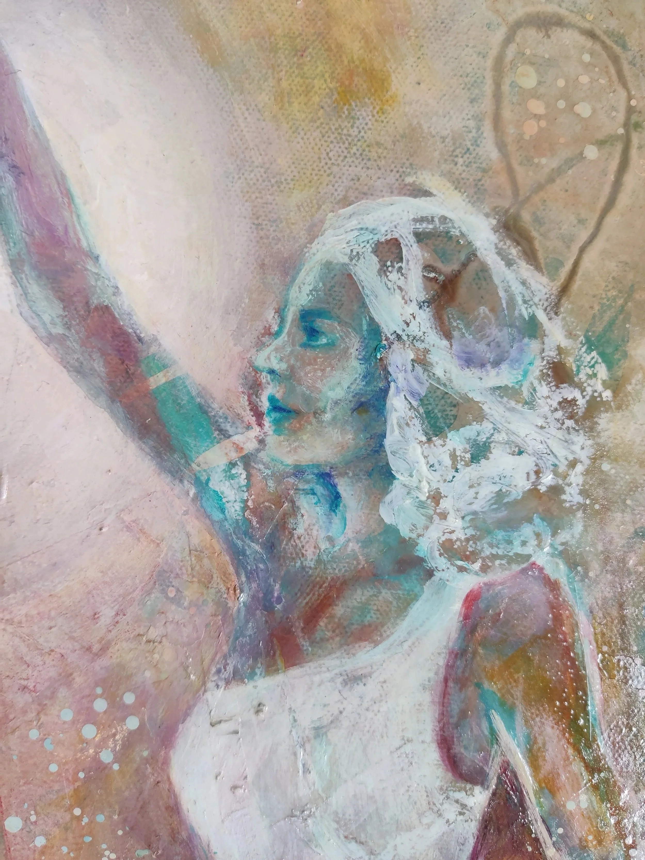 The figure emerges from a richly textured foundation — the abstract groundwork laid in collaboration with Sabrina Laumer, whose expressive gestures created the energetic soil from which this image took form. Built upon that intuitive terrain, the final composition is a visual meditation on strength without hardness, vision without fear.